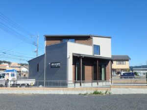 45度に振っていますリビングが特徴の家です。(日射取得の関係です。パッシブデザインの考え方です)