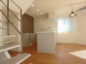 階段の鉄骨手摺や、キッチンも良い感じです。背面収納の棚は、今日付けています( ^)o(^ )