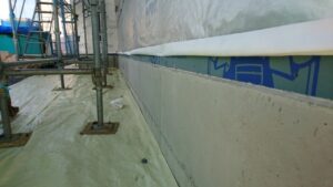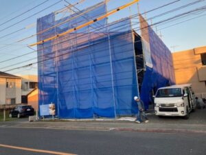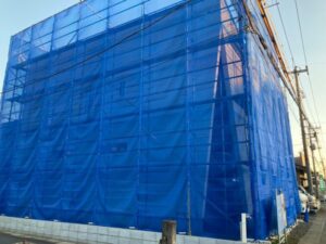 足場のネットが3mmメッシュなので建物は、あまり見えませんが