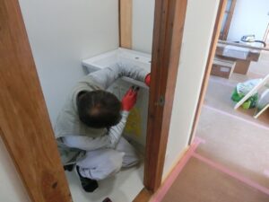 洗面化粧台を取り付けているようです~顔がみえませんが・・招待は、?