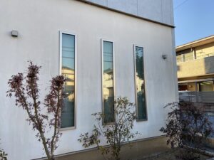サッシの角から雨垢がたれていますがその辺は、軒の出に関係しています。