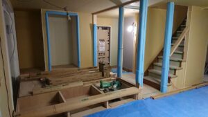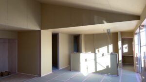 西モデル「松尾モデル」の室内です。小上がりの下に引出収納が入る箱が完成しています。