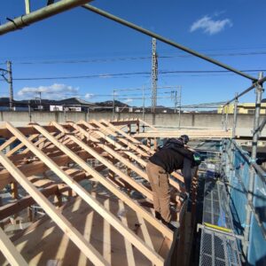 順調に棟があがり~タルキまで進んでいますね(^^♪