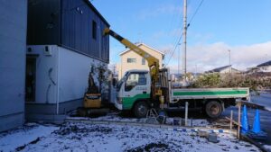 この前朝雪の日に外構もはじまりました。3月19日にむけて順調にすすんでいます。
