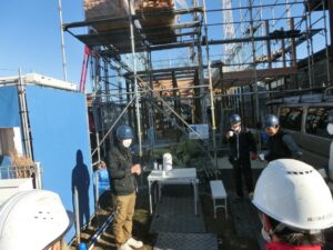 棟があがり~余裕で携帯をみている「アキラー」監督兼大工(さぼってませんよ( ゚Д゚))