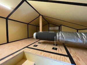 小屋裏です。このカウンターアローファンでエアコンの冷気を下まで送ります。