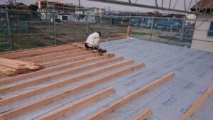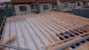 母屋の上にタイベックシルバーを貼り(3次防水)