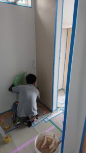 このように塗ったばかりは、色たついて見えますが乾くと白になっていきます。