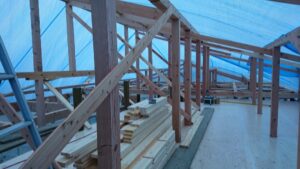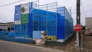 13日に建て方を行い、昨日、シート養生や、落下防止ネットを張りました。