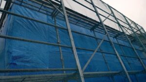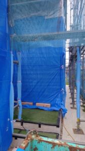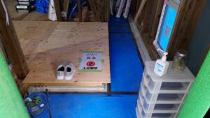 室内は、玄関土間は、モップで掃除できるプラスチック製の養生をしています。