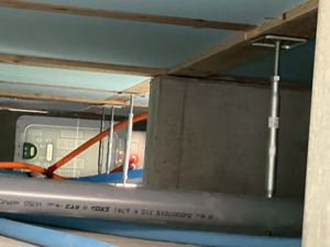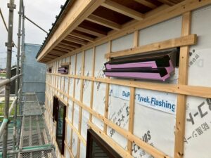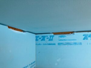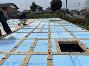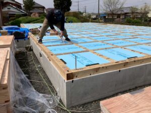 土台と、大引きの間のスタイロエースを敷き込みその間に気密を取る為にキーキングをしています。