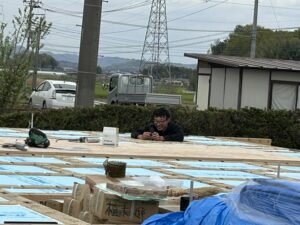 「アッキー」ありがとう。 土台工事は、最終根太レス合板を敷いて終了となりました。(^^♪